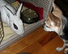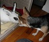 Christian and I had a midnight rendezvous with my fellow volunteer, Steve. Steve was kind enough to drive NOLA refugee, Maybelline, to Princeton from the Pasado’s Safe Haven triage center in Raceland, LA. Paquita was very excited and a little scared upon seeing our new family member. She wagged her tail and sniffed wildly and Maybelline didn’t flinch a bit. She hopped right up to us and sniffed back just as furiously. This all transpired at 2:30 this morning, so the meeting was brief. This morning, Paquita didn’t even get out of bed, so she must have forgotten about her new roommate. Was it a dream? Eventually she came in to my office to say good morning and then saw the cage. OH YEAH, WE HAVE A RABBIT! Return to frenzied mutual sniffing.